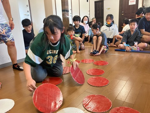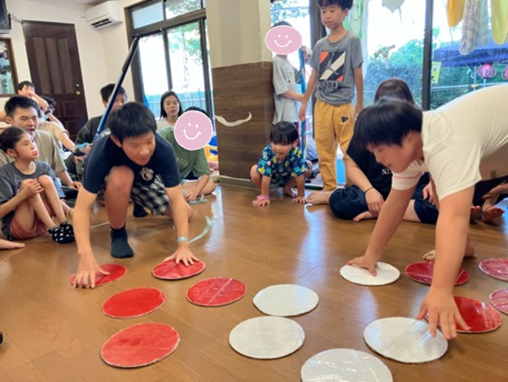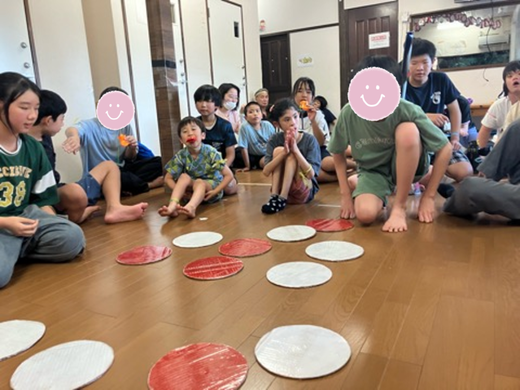 足踏みで歩数を競うゲーム、丸く切った赤白の段ボールを自分のチームの色に替えるゲームなどなど、、、、